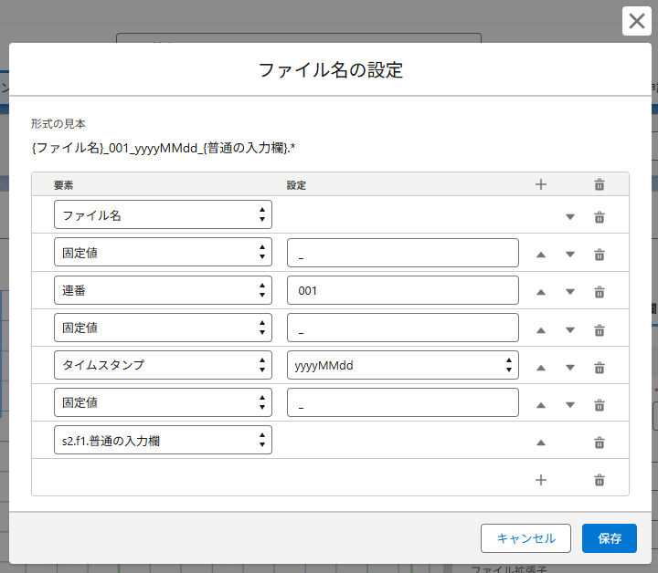 ダイアログで、この入力欄に入力されたファイルがSalesforce上に保存される際のファイル名を指定することができます。画像のように要素を組み合わせ、動的なファイル名を構築することが可能です。各要素が指すものを以下に列挙します。