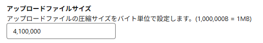 JPG, PNG形式のファイルについては、アップロード可能なサイズとなるよう、入力時に自動で縮小される旨を先述しましたが、その上限を既定の4,100,000Bよりも更に小さくしたい場合に設定します。アップロードされるJPG, PNG形式のファイルは、ここで指定したサイズ以下になるように縮小されます。この設定の最大値は、初期値と同じ4,100,000です。