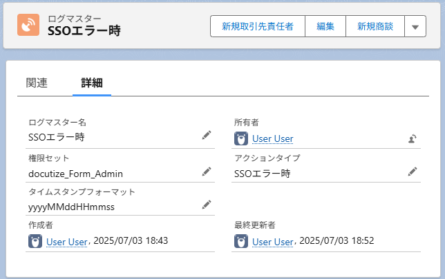 v4.7で追加した、SSO成功時・エラー時の情報を記録する機能を使用する場合は、「1. 認証プロバイダーの設定」に記載のある権限セット"docutize_Form_Admin"付与のほか、以下の通りログマスターレコードを作成してください。以下のように設定することで、SSO成功時・エラー時に、詳細な情報が保存ログレコードとして記録されるようになります。