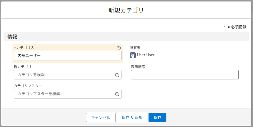 [新規]ボタンを押下しカテゴリを作成します。カテゴリ名は必須入力となります。