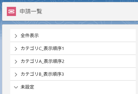 カテゴリの新規作成ページ、または詳細ページから、「表示順序」という項目を編集することができます。この項目には数値を入力することができ、申請一覧画面で昇順に並んで表示されます。