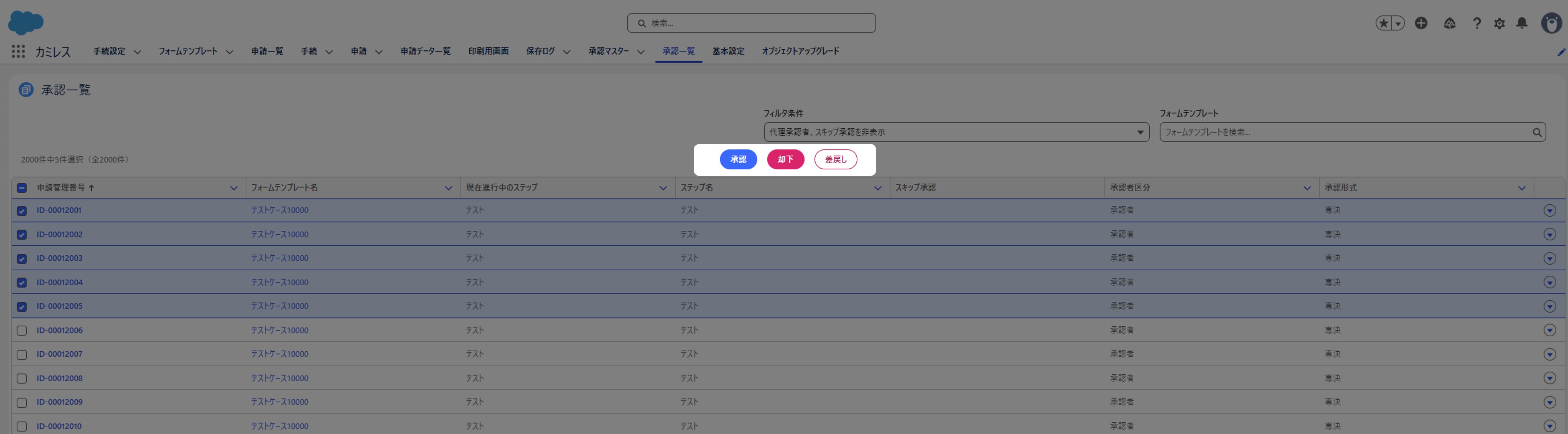 承認一覧は、あなたが承認者として割り当てられている申請を一覧表示し、まとめて承認・却下・差戻しができる画面です。