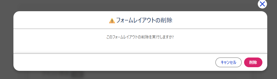 現在表示しているレイアウトを削除するには、画面上部の 「▼」(メニュー)ボタン → 「削除」 をクリックします。 確認ダイアログが表示され、「削除」を選択するとレイアウトとその配下のすべてのセクション・項目・入力欄が削除されます。