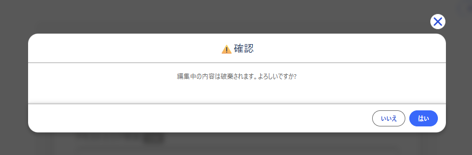 画面上部の 「キャンセル」ボタン をクリックすると、確認ダイアログが表示されます。 確認ダイアログで続行を選択すると、前回保存時の状態に戻ります(編集内容はすべて破棄されます)。